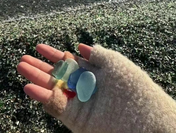 【玻璃海滩】网红打卡地早在苏联时期,人们三五成群在海边喝酒,喝完了酒就把空酒瓶子摔在海滩,于是,天长日久,无数酒瓶子的玻璃碴子经过海水的侵蚀,在海浪的冲刷下被打磨得光滑圆润,便形成了如今著名的玻璃海滩